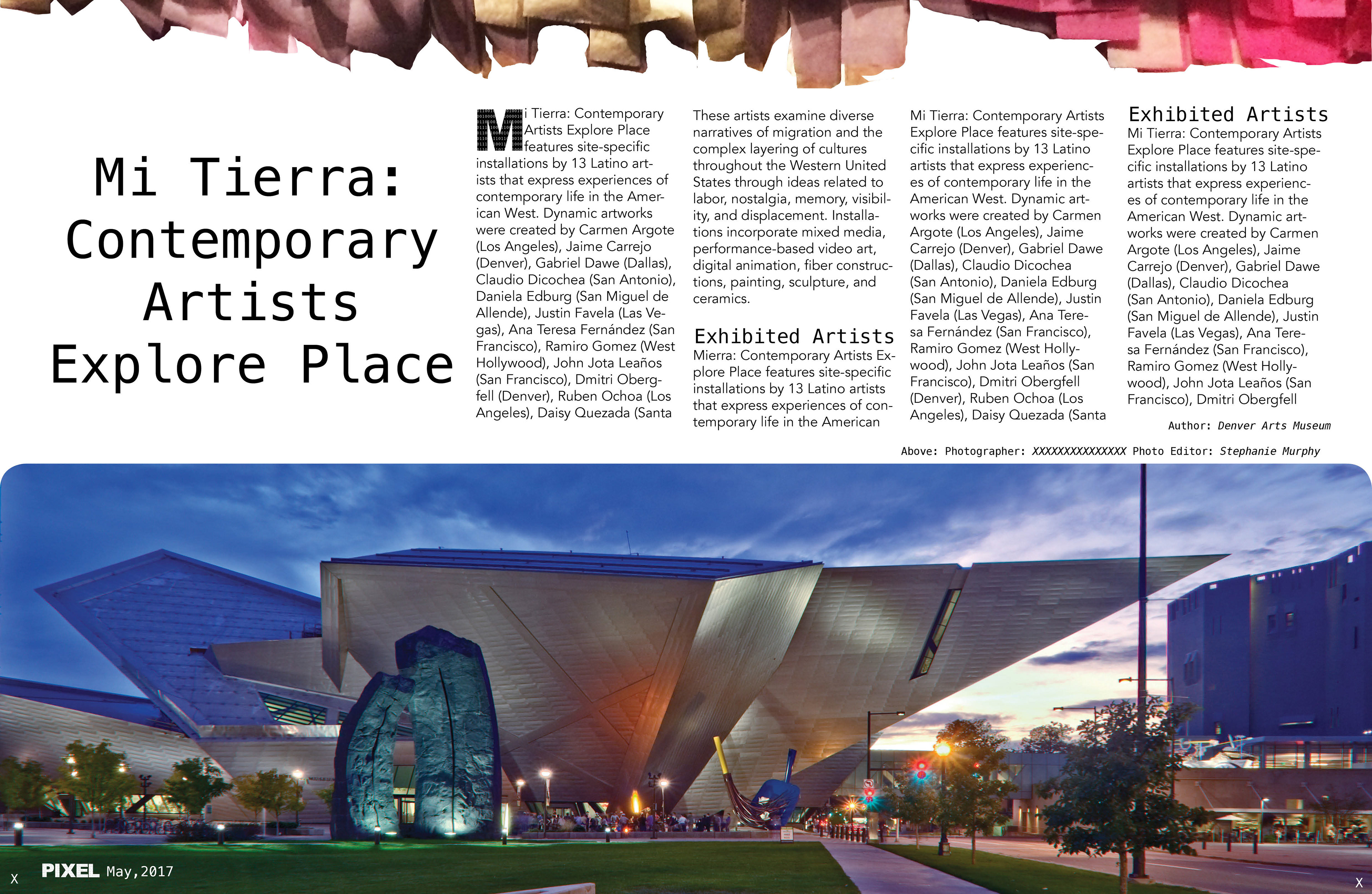 The next step in this process was to create 3 features for the magazine. I decided to focus on creating a feature about at art exhibit in Denver called Mi Tierra and a feature about Arduinos.